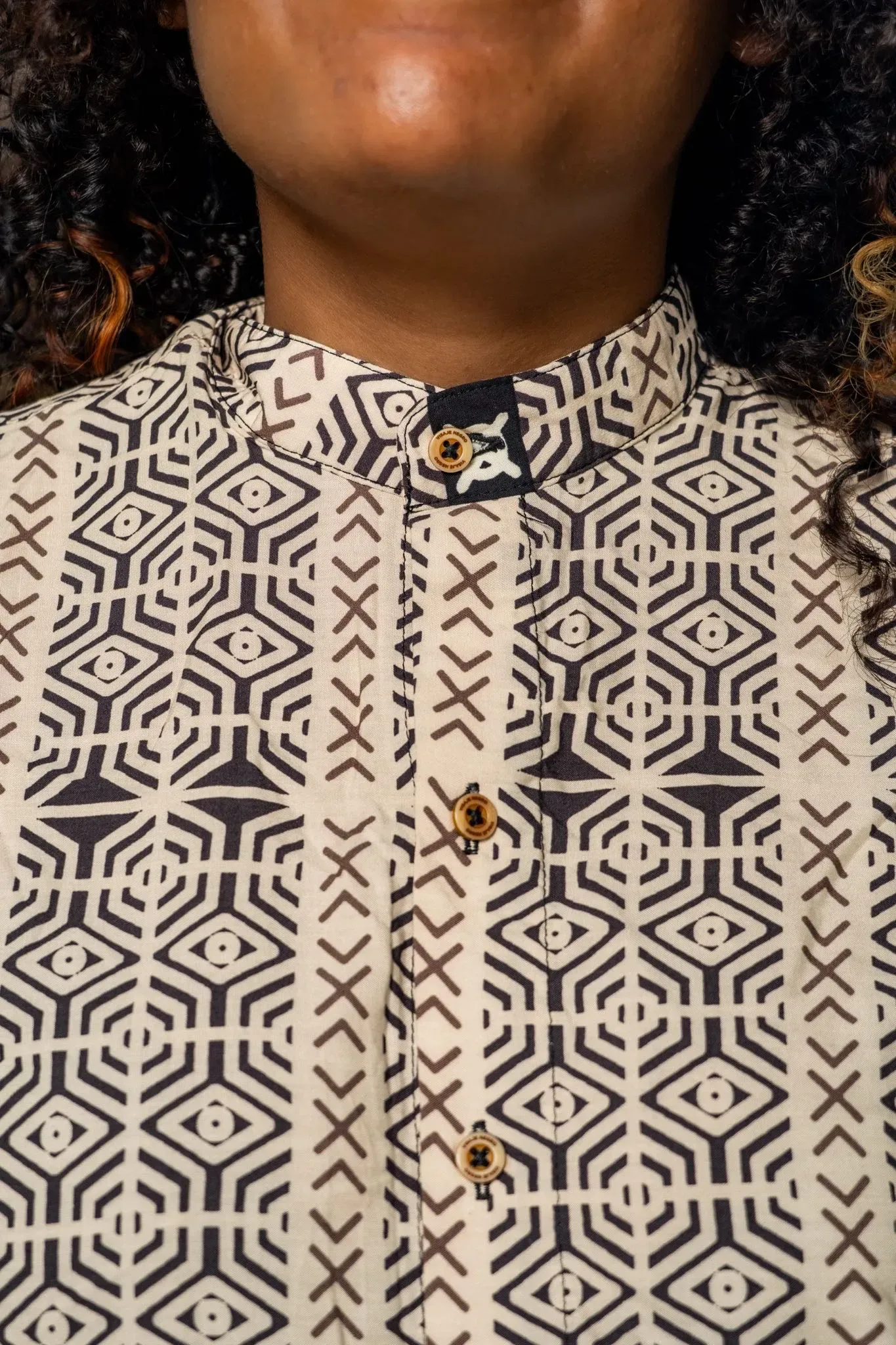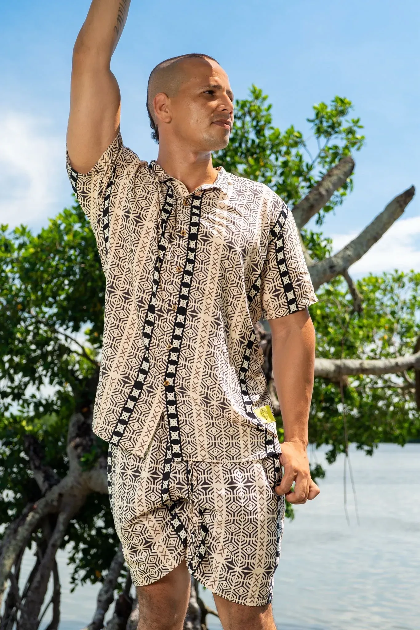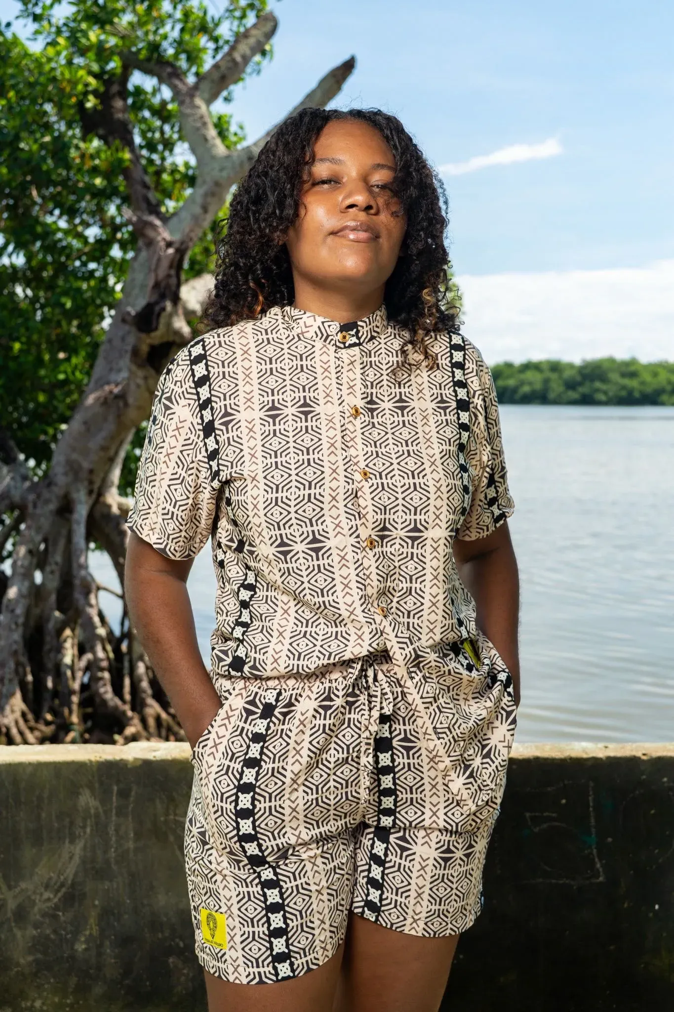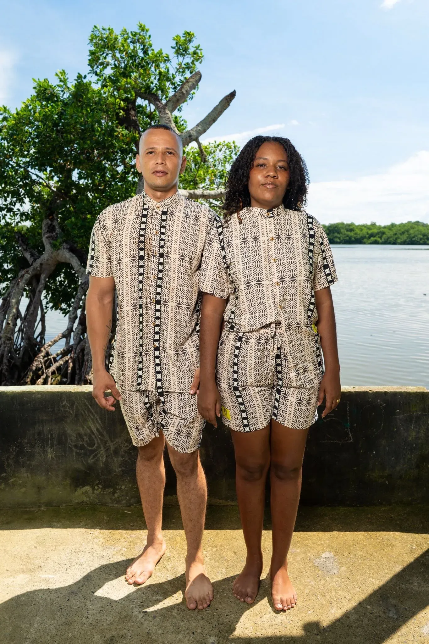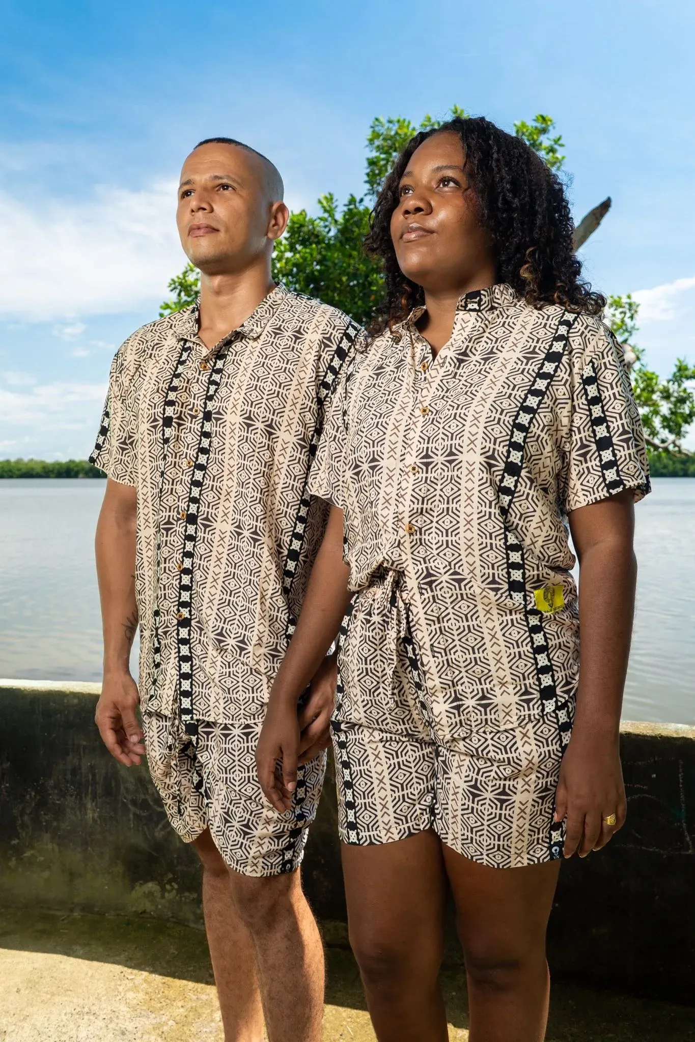 Camisa sin género de manga corta con estampado BARCAZA y cuello NERÚ, elaborada en viscosa fresca para un estilo único y cómodo. Ideal para quienes buscan prendas versátiles y con personalidad. ¡Luce a la moda con esta camisa Tierra Viva en visaje negro!