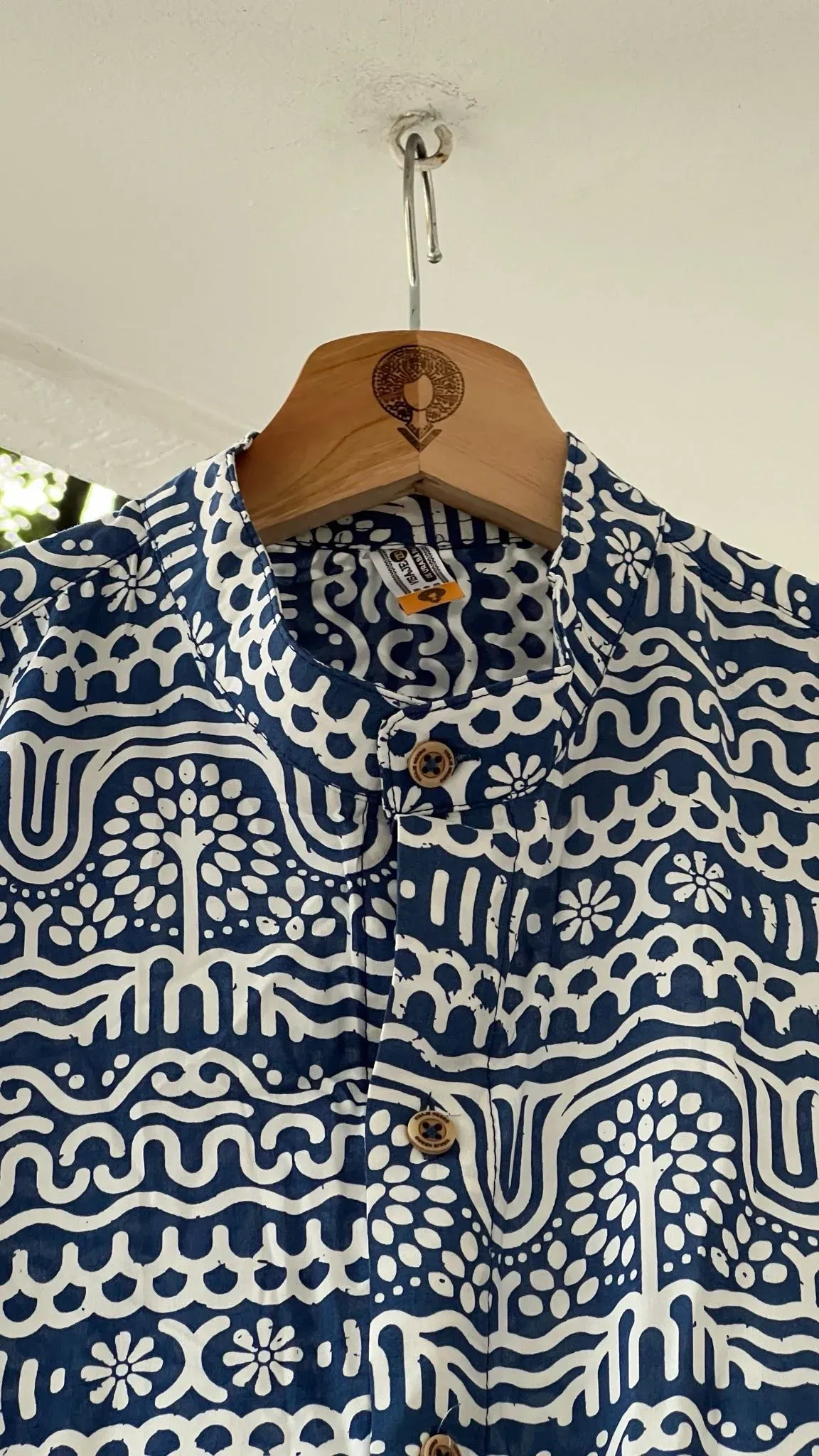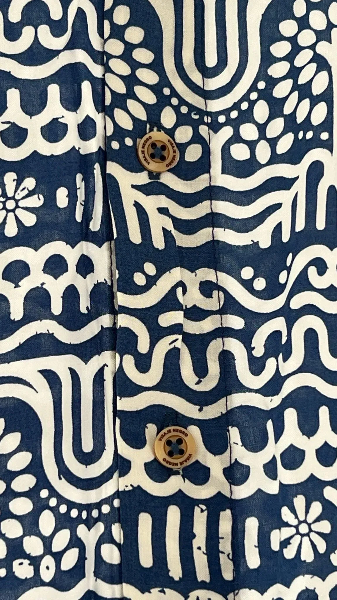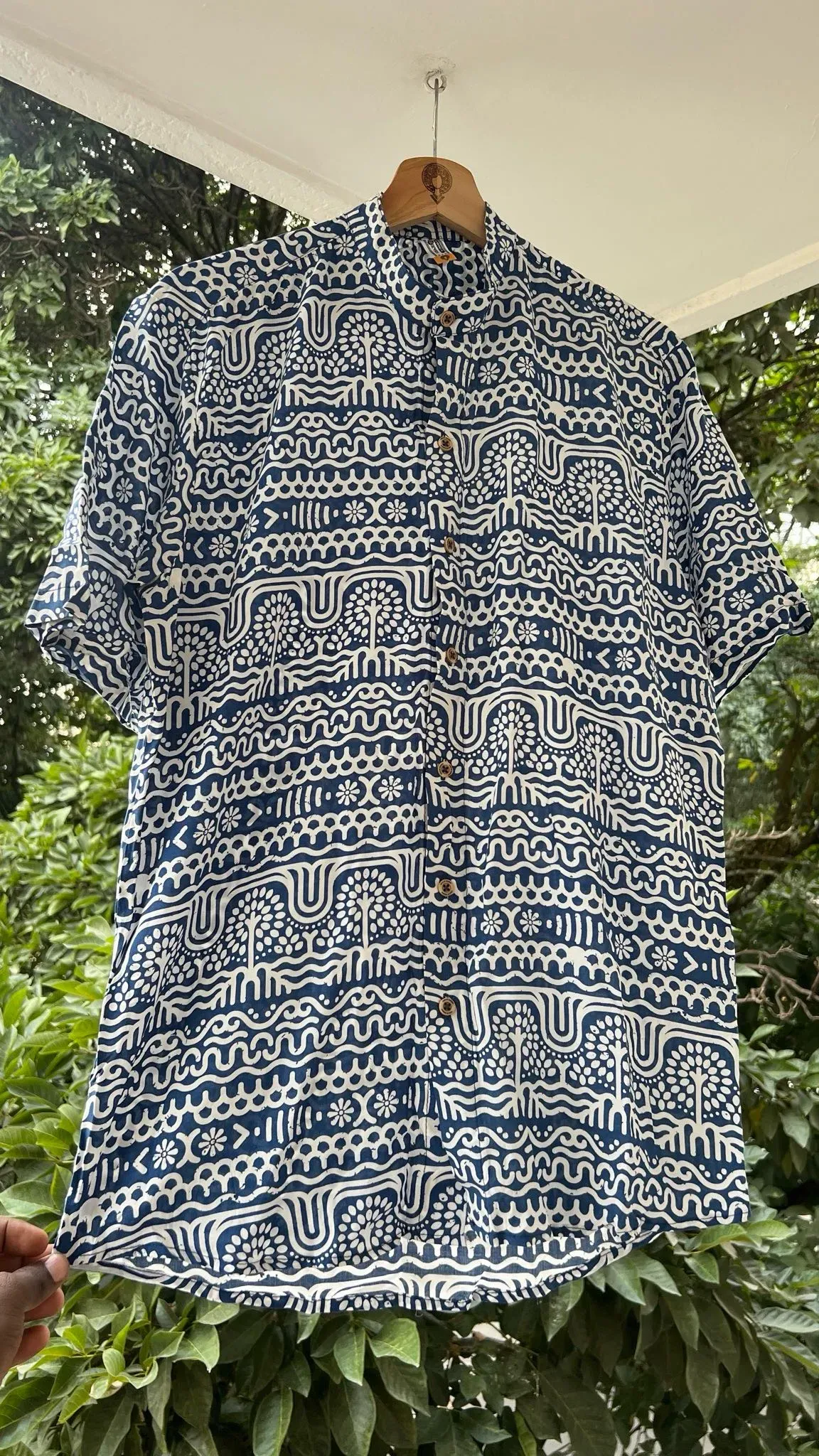 Camisa sin género de manga corta, hecha en 100% viscosa fresca. Su estampado exclusivo Río Suriquí evoca la fuerza y fluidez del agua. Con cuello inglés y un di...