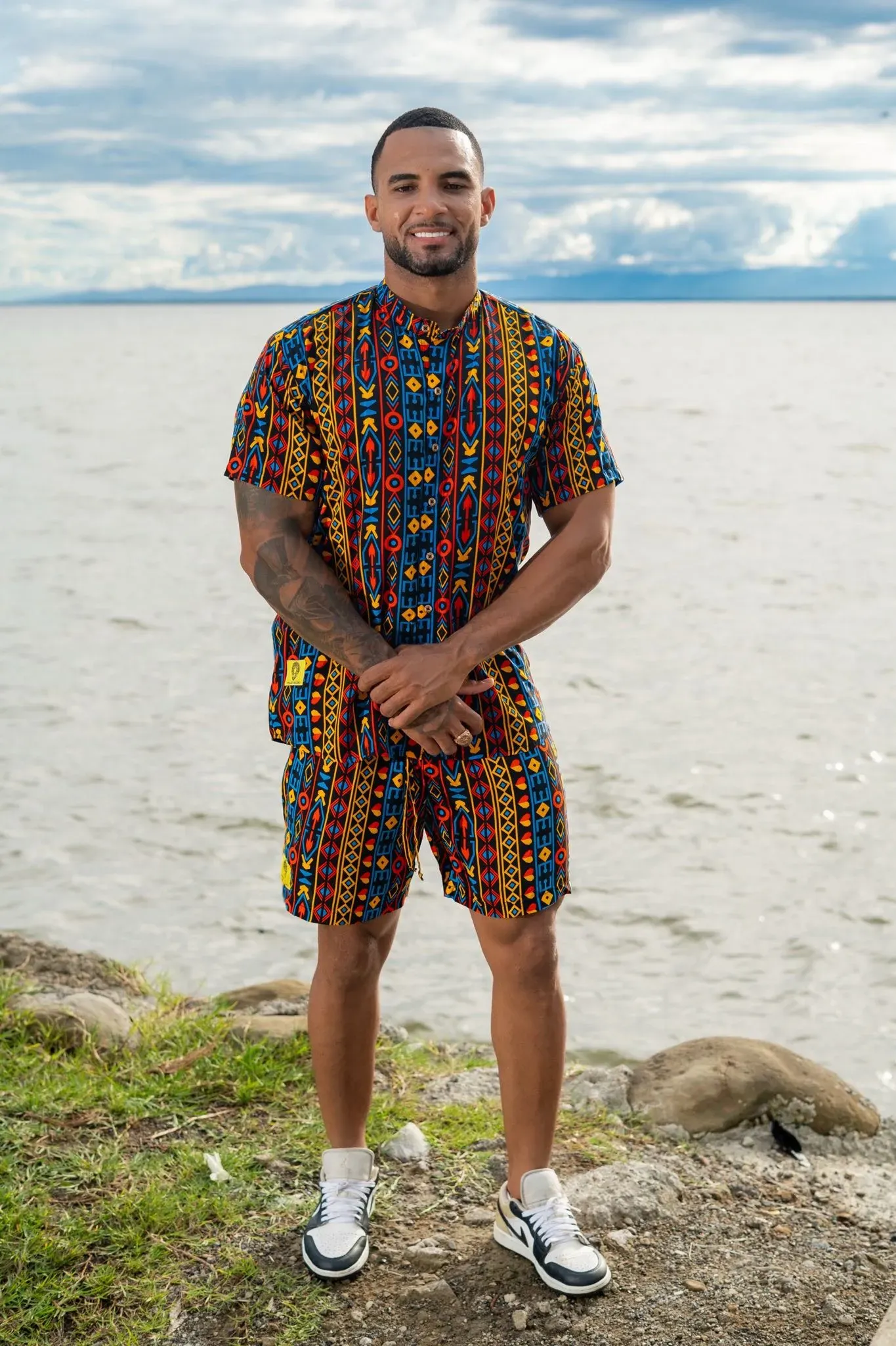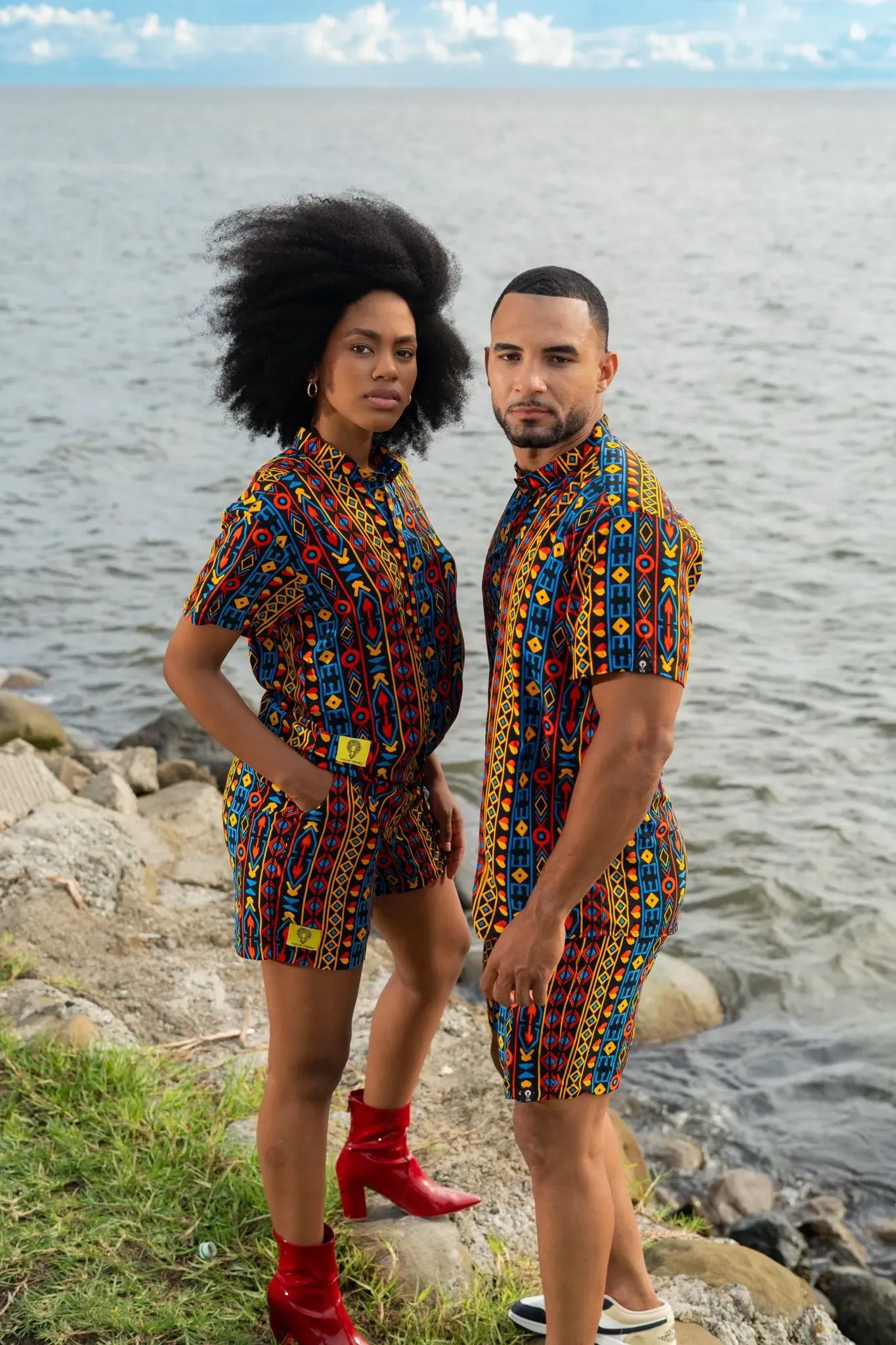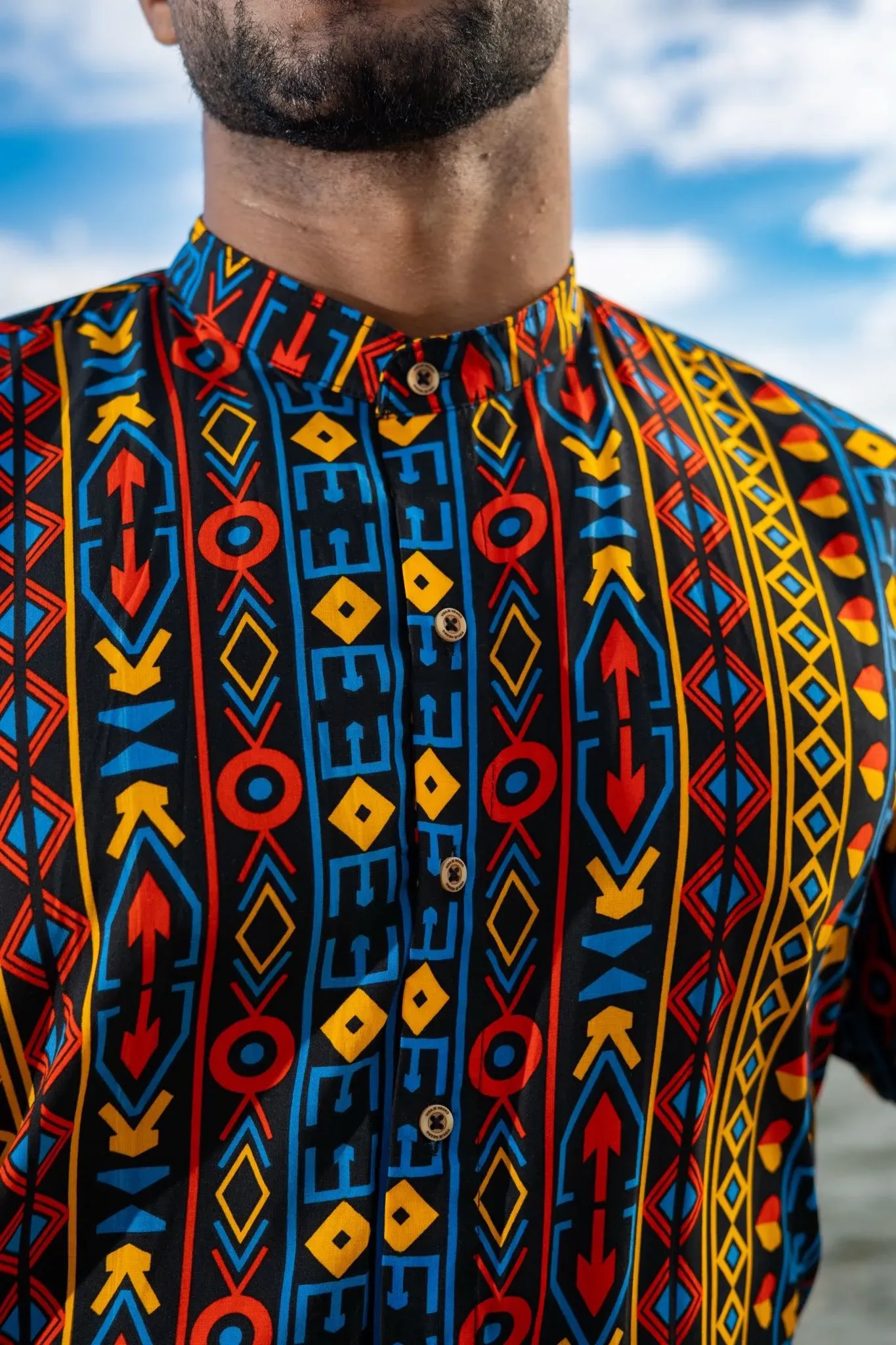Camisa sin género de manga corta con estampado El Alba, cuello NERÚ en viscosa fresca. Ideal para un look moderno y fresco. Hecha en 100% viscosa de alta calidad. Disponible en color negro. ¡Destaca con esta camisa única y versátil!