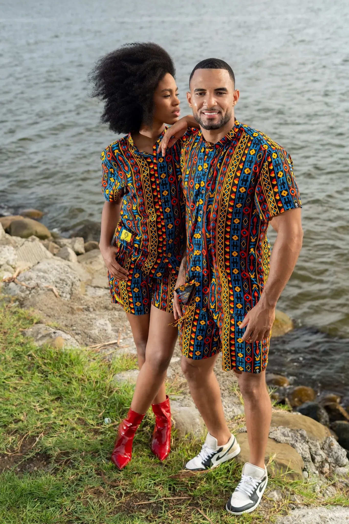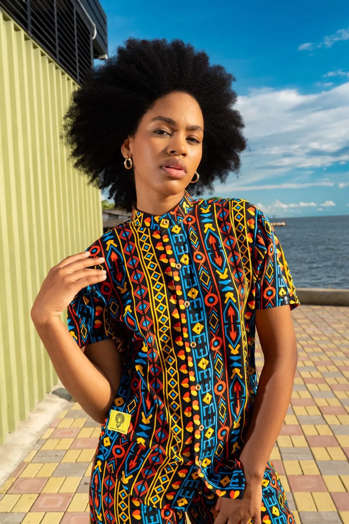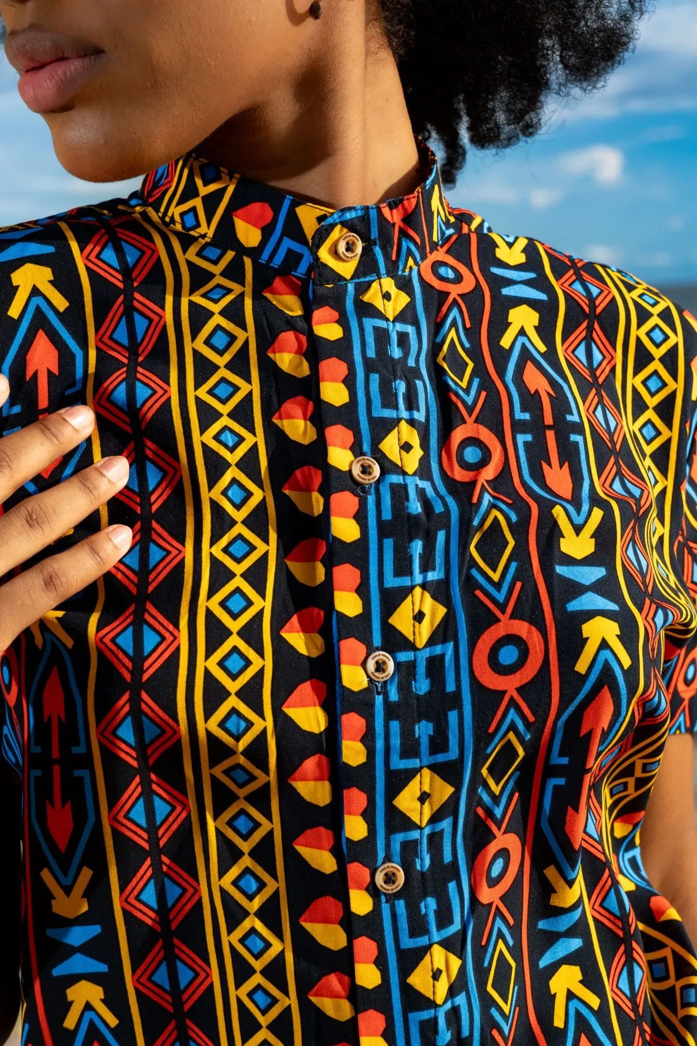 Camisa sin género manga corta estampada El Alba con cuello NERÚ en viscosa fresca | Visaje Negro