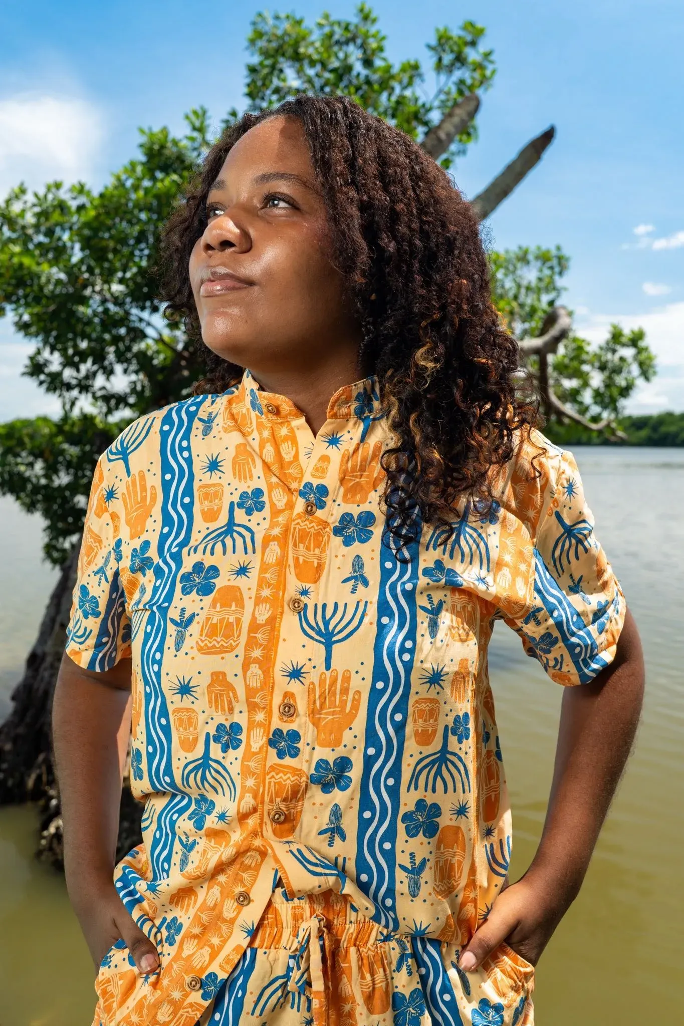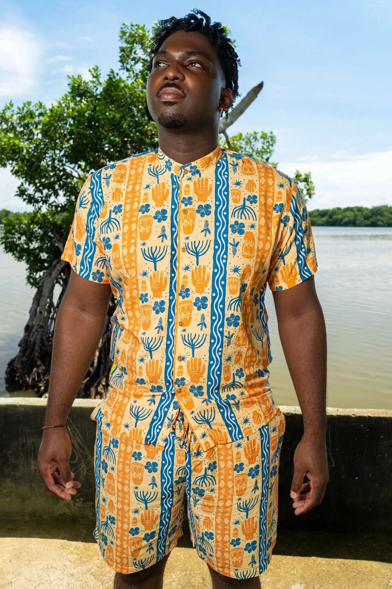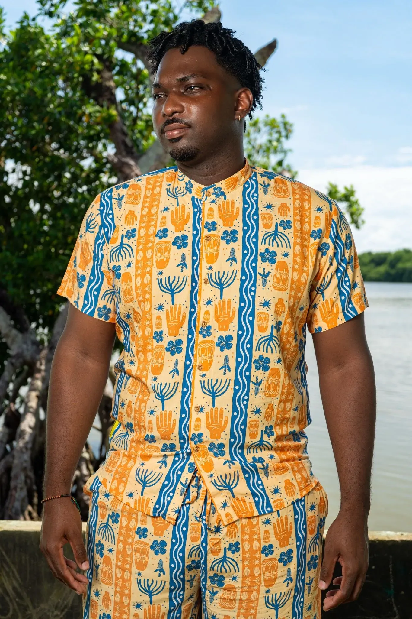 Camisa sin género manga corta estampada BULLA Y PESCA con cuello NERÚ en viscosa fresca | Visaje Negro