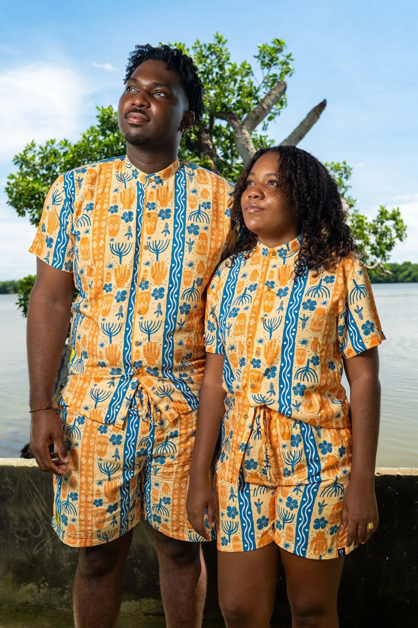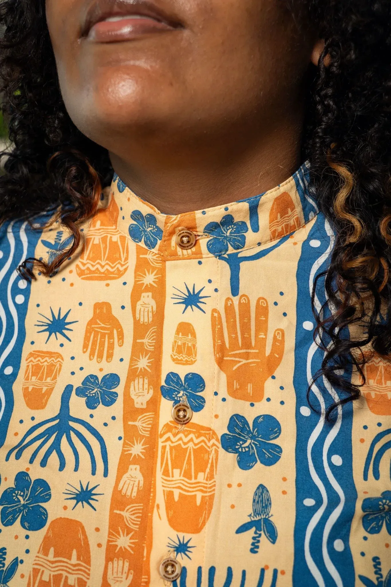 Camisa sin género manga corta estampada BULLA Y PESCA con cuello NERÚ en viscosa fresca | Visaje Negro