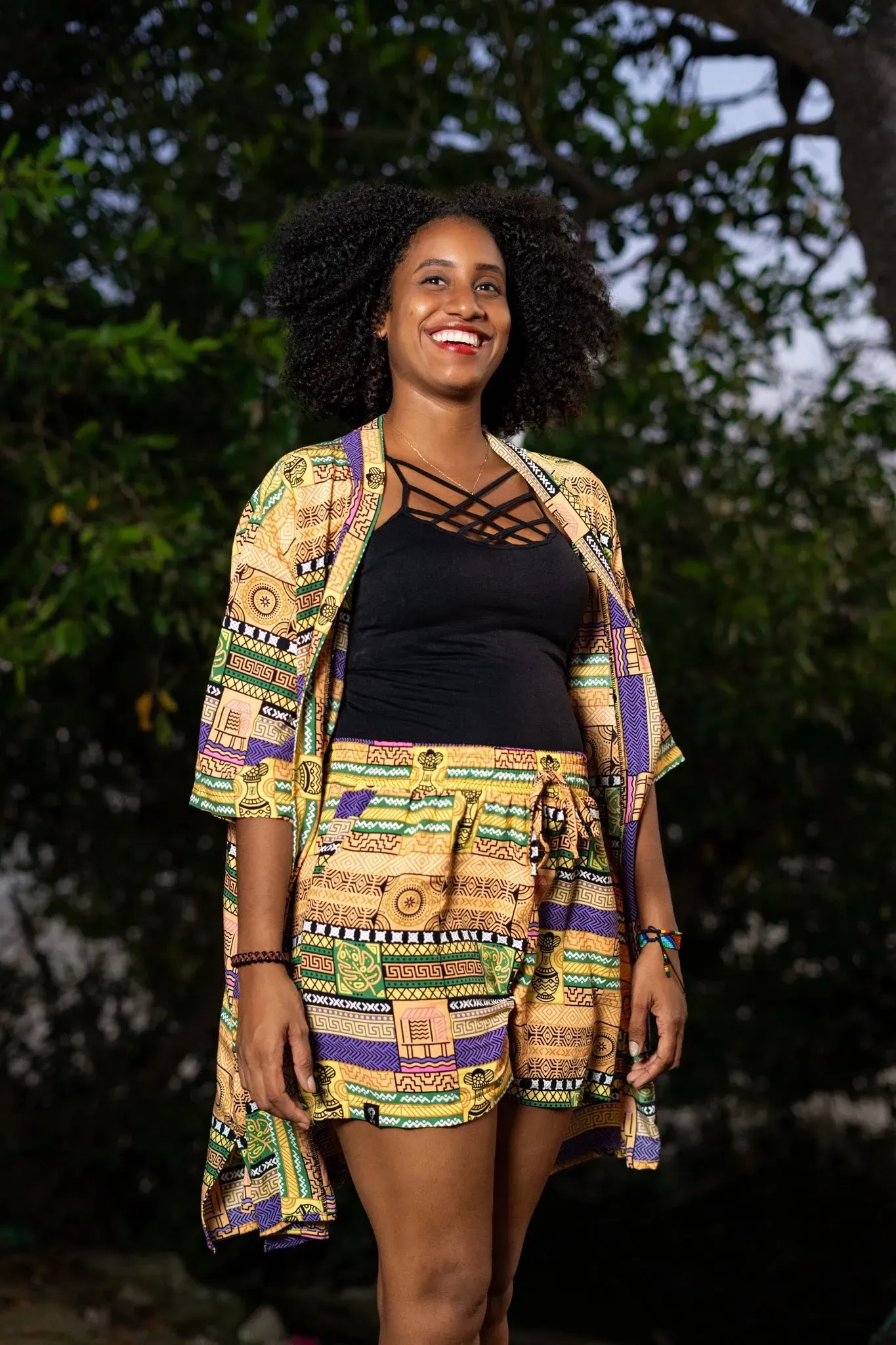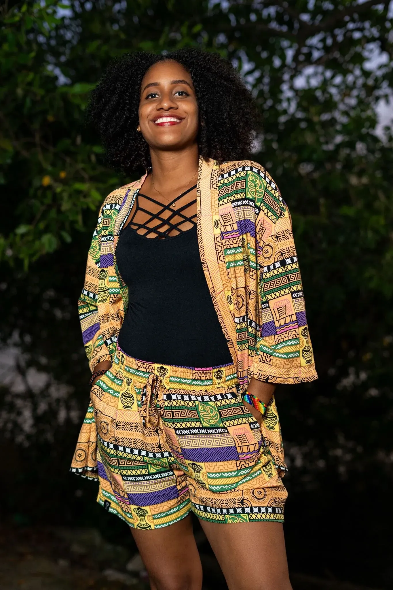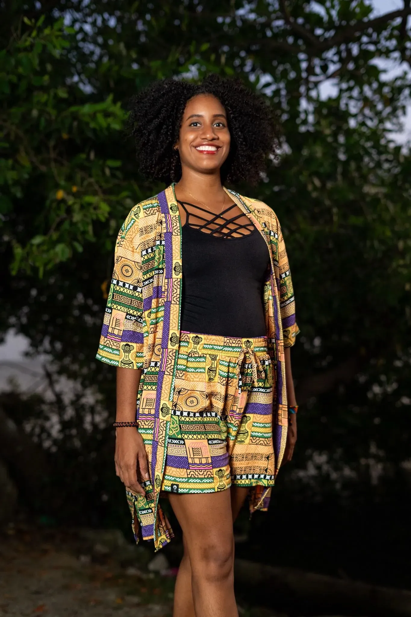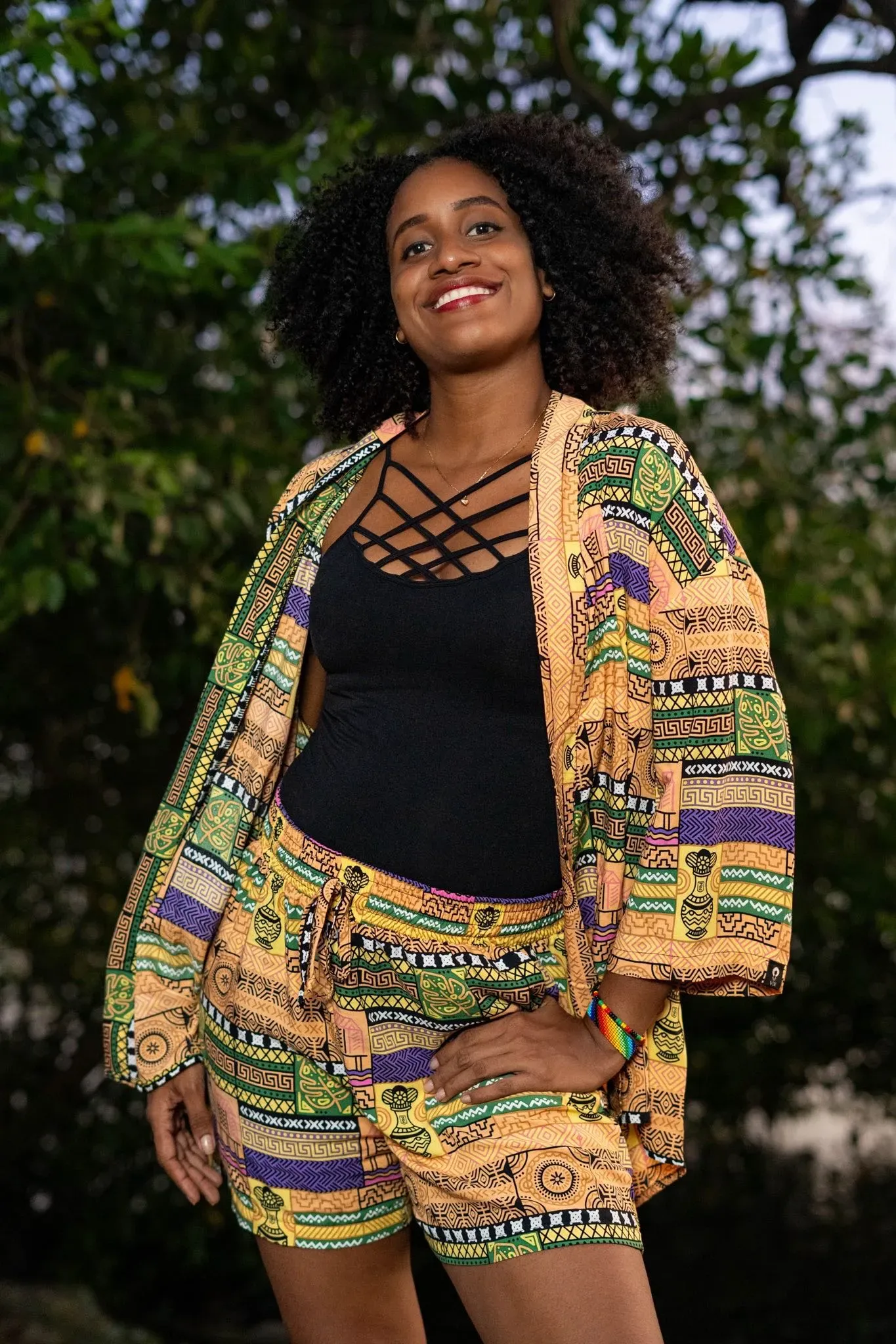 Kimono corto sin género con estampado exclusivo de artesanos afrocolombianos en tela fresca de viscosa. Este kimono corto de Visaje Negro es una pieza única que refleja la cultura y la artesanía de Colombia. Ideal para un estilo moderno y auténtico.