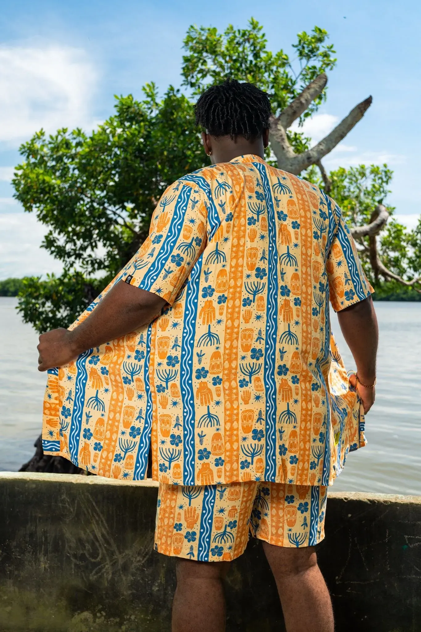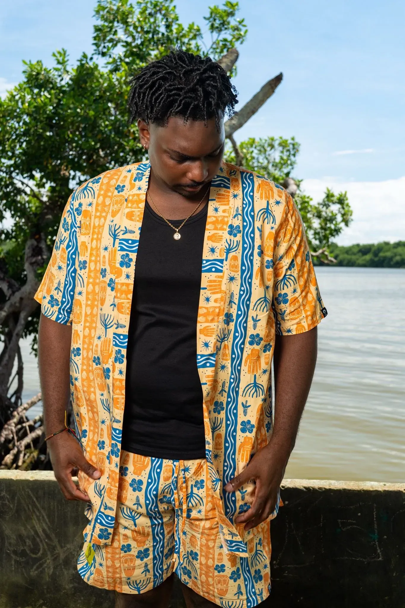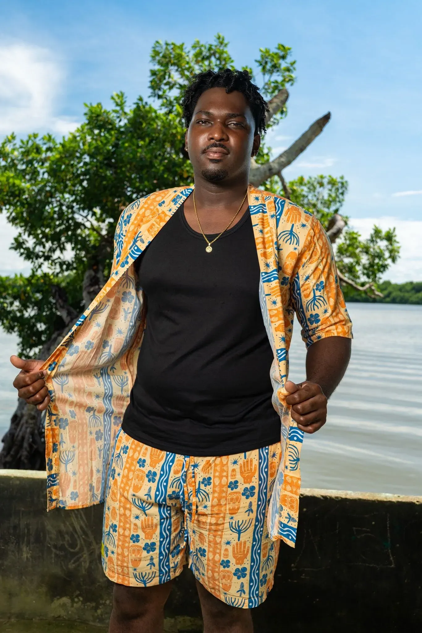 Kimono corto sin género con estampado exclusivo de bulla y pesca, confeccionado en fresca tela de viscosa. Este kimono refleja la cultura afrocolombiana con un diseño único en visaje negro. Ideal para lucir con estilo y comodidad en cualquier ocasión.