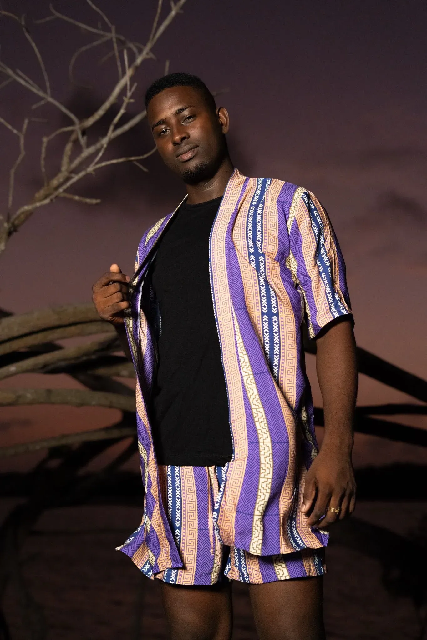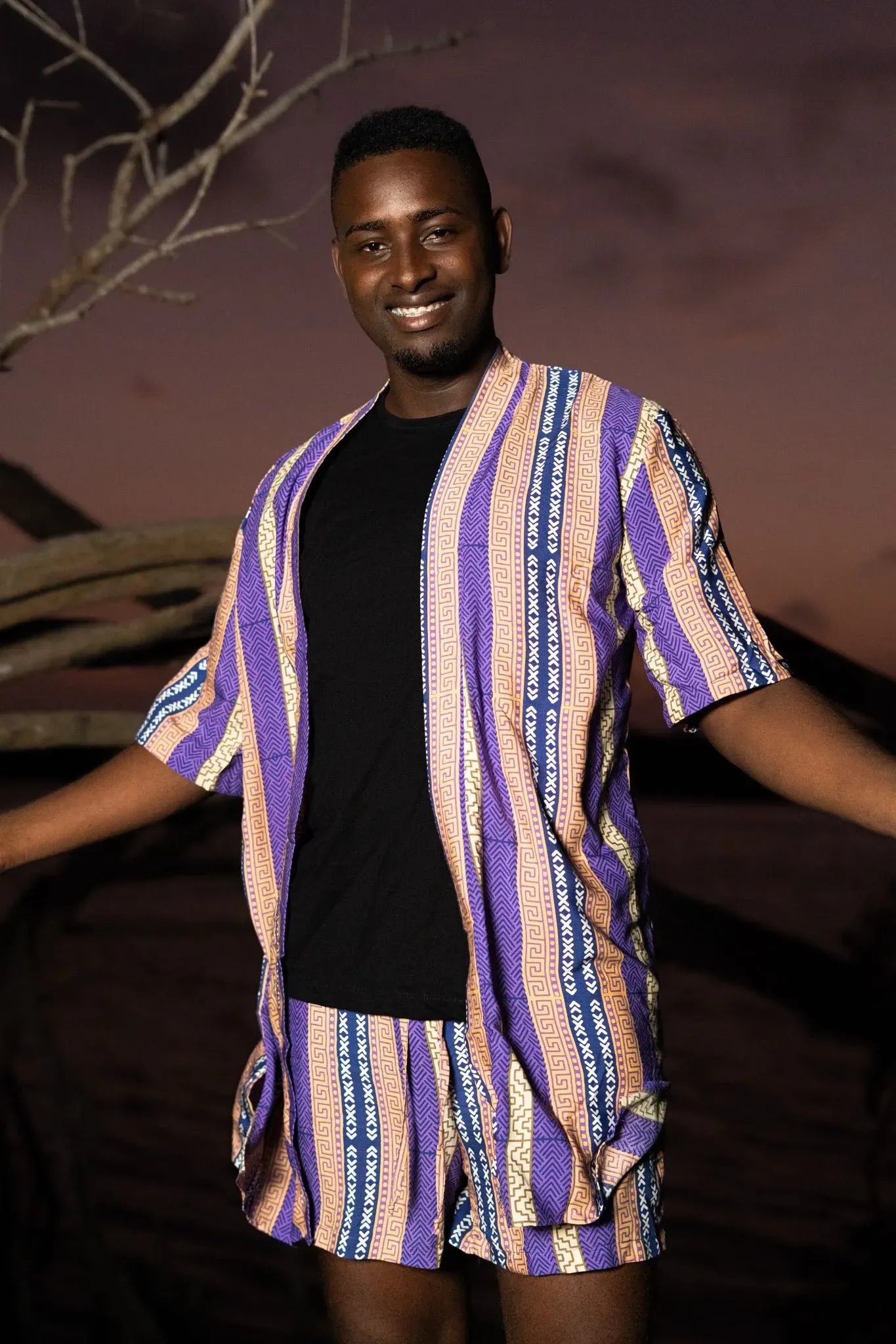 Descubre nuestro kimono corto sin género, confeccionado en 100% viscosa fresca. Estampado exclusivo Tierra Viva, inspirado en la cultura afrocolombiana. Visaje Negro.