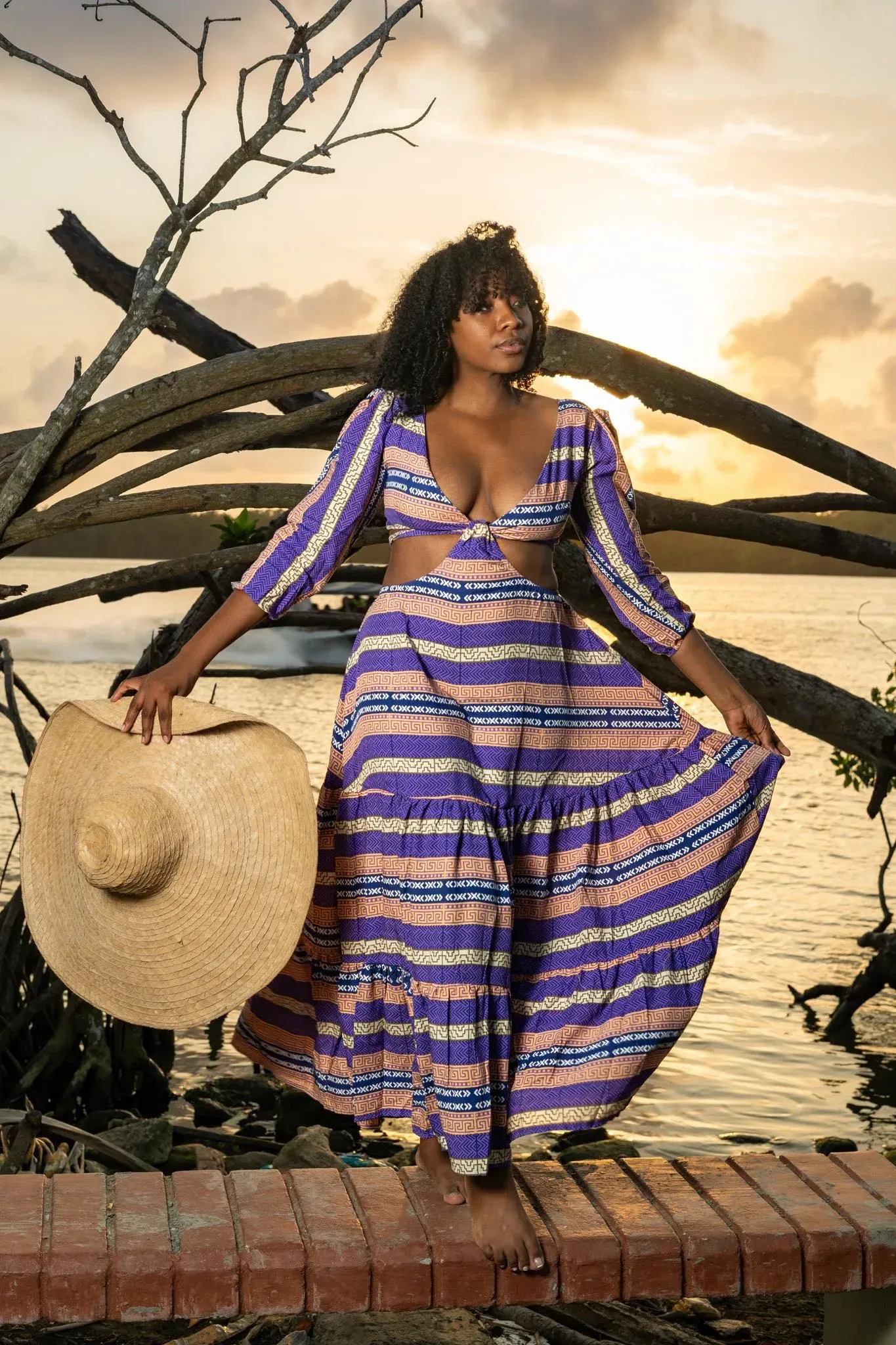 Vestido largo Tierra Viva, inspirado en la diversidad de Urabá con estampado exclusivo de mapas de suelos en tonos morados y tierra. Hecho por mujeres artesanas en Turbo, Antioquia, con tejido suave y ligero de bajo impacto ambiental. Ideal para looks frescos y sofisticados con identidad cultural.